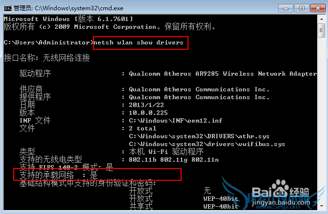 通过命令查看网卡是否可以做发射热点用。看图,点运行后输入“cmd”,然后在黑框框里输入 netsh wlan show drivers 看图中红框内,如果是“是”,恭喜你,你可以的。如果是“否”,那你就看到这里吧。你可以去看看我的其他经验。