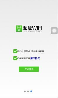 总共有三个界面,往左划屏幕便可进入下一界面,当进入到第三个界面是,只需点击立即体验,便可开始使用超速wifi: