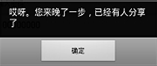 当用户分享时,密码能正确连接的,显示“分享成功”;如果密码连接不上的,提示“密码不对,分享失败”;如果有人分享过后会提示“哎呀,您来晚了一步,已经有人分享了”: