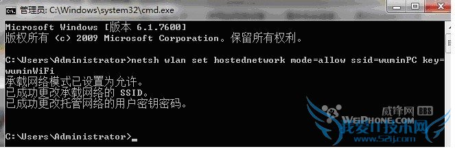 运行命令:netsh wlan set hostednetwork mode=allowssid=wuminPC key=wuminWiFi