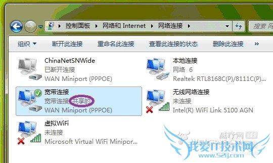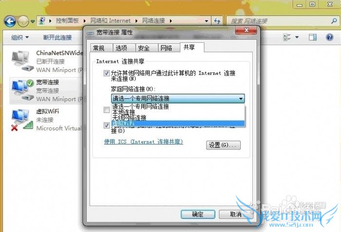 3、设置Internet连接共享:在“网络连接”窗口中,右键单击已连接到Internet的网络连接,选择“属性”→“共享”,勾上“允许其他······连接(N)”并选择“虚拟WiFi”。