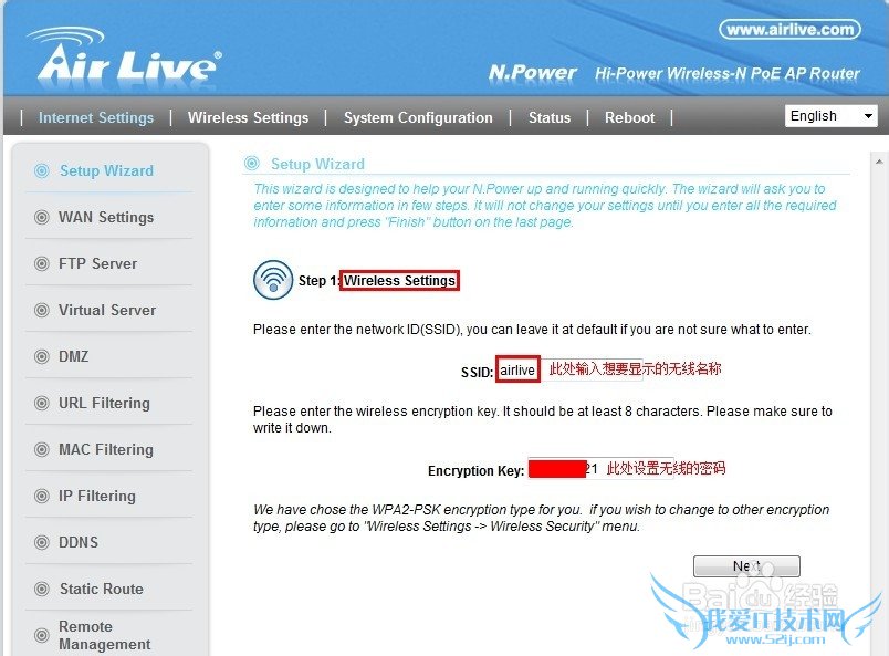 ④、进入路由器后可以查看路由器的状态和进行一些配置的修改。在此我们设置无线路由,路由的界面如果是中文版,直接找到无线设置字样的部分进入设置就行,如果路由界面是英文版的,无线设置会出现wireless settings之类的字样,如下图所示,为方便查找自己的无线和进行连接,可以设置一个自己喜欢的网络名称,并修改密码以保护自己的网络。