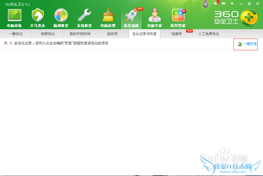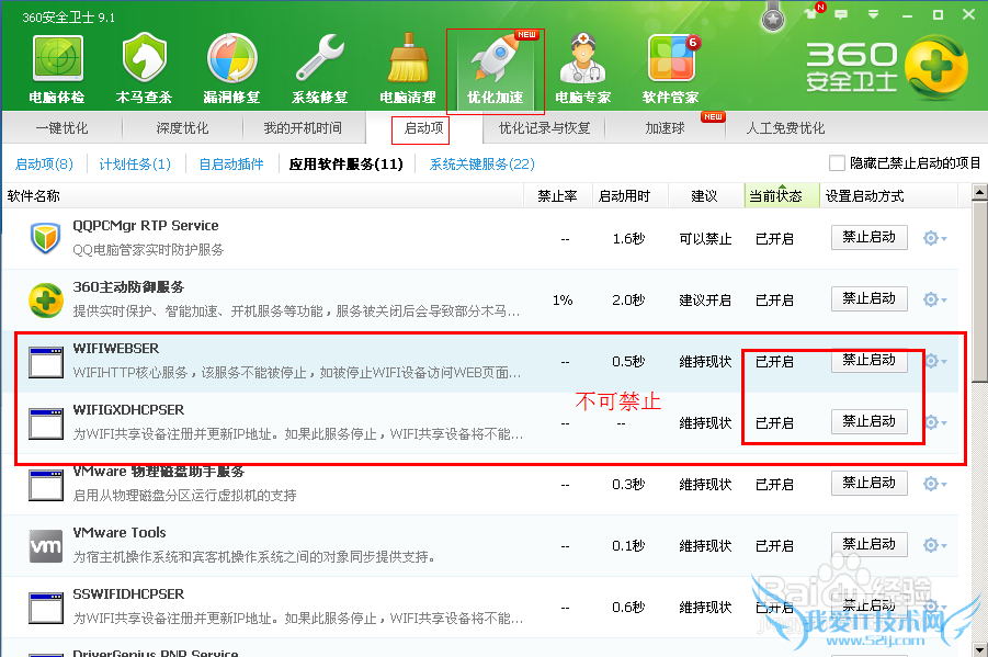 2.谨慎使用“360加速优化”,禁止wifi相关服务,可能会影响wifi共享精灵的正常使用,这是可以使用“一键恢复”: