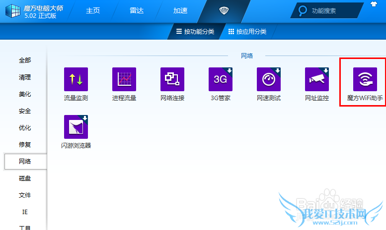 在功能大全的做侧边栏,点击网络,然后找到魔方WiFi助手,单击下载模块并且打开