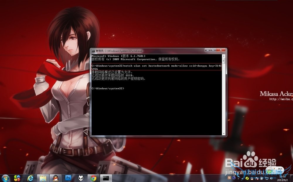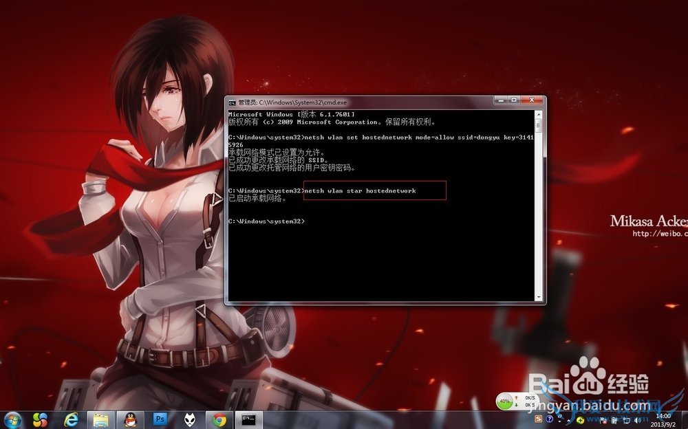 第二步:在命令行里,键入 netsh wlan set hostednetwork mode=allow ssid=dongyu key=31415926 这个ssid后面就是WIFI用户名,自己随便输我这里输dongyu,到时候搜索到的热点名字,就是dongyu,,,key后面密码,随便输,),输完后回车,会出现下图设置成功信息