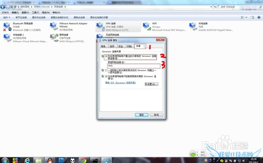 第七步:选择共享,图中2打钩,图中3所示下拉选择wifi(如果你刚才改的是其他名字,选你改的名字),然后点击确定。