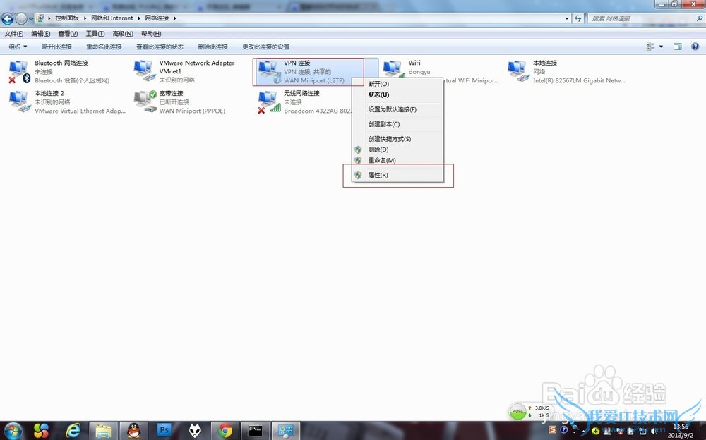 第六步:找到你上网的那个连接,我是校园网,用vpn上网的,所以用的是vpn连接(家庭用户一般是本地连接或者宽带连接),右击打开属性。