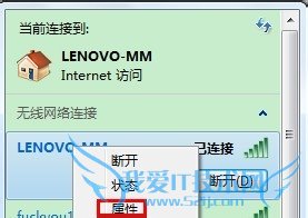 在连接的网络上单击鼠标右键,弹出菜单,点击属性