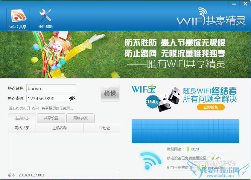 在试用过多种软件版本后,wifi共享精灵应该是目前网络上最好用的wifi共享软件了,下载安装wifi共享精灵后,就可以将有线网络信号转化成无线网络信号,从此智能手机就能轻松无线上网,零流量零资费零负担!