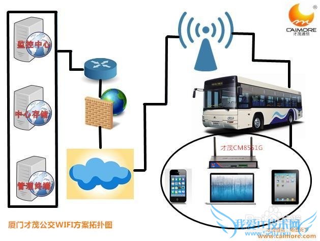 2. 安装建议:如安装在车子前部或尾部,该方案利于线路铺设及电源供给,但这两种方案的WIFI信号均匀度会因为客观原因而受影响;基于公交WIFI信号覆盖均匀度的考虑,我们通常建议将才茂网关WIFI设备安装于车子中部,此方案需考虑线路铺设、电源供给以及安装成本等问题。