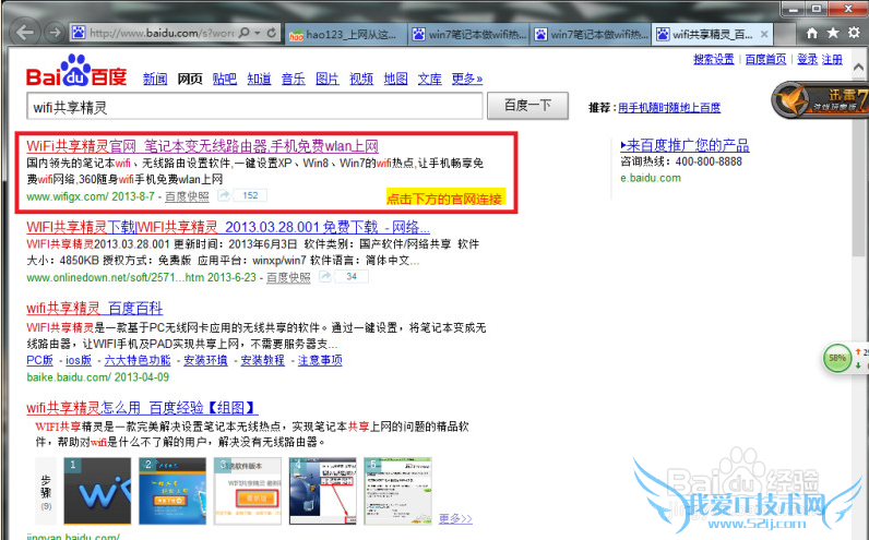 在现在手机无限泛滥 的时候,连接无线网络成了我们休闲娱乐的好办法,但是很多朋友在拉了网线过后首先要考虑的是购买一台有足够传送速率的无线路由,这就难免我们要自掏腰包甩出我们白花花的大洋了 .现在就是让你摆脱购买路由的苦恼,见证奇迹的时刻到了. 我们不用在网上大搜“WIN7如何做WIFI 热点”,的答案,这样只有繁琐的设置和让你沮丧的失败。从而让你对设置热点不抱希望。好了不罗嗦了 现在我们直入正题……首先我们在百度上搜索“wifi共享精灵”。如下图1