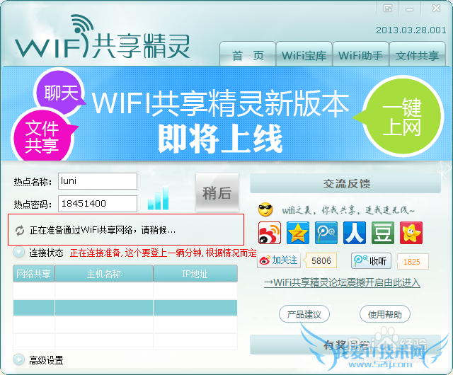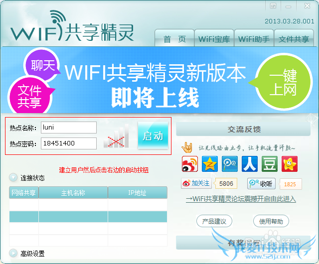 接下来我们解压文件然后安装,运行后的页面如下图3 然后我们所做的就是创建我们的热点名和密码,点击启动按钮等待奇迹的到来!