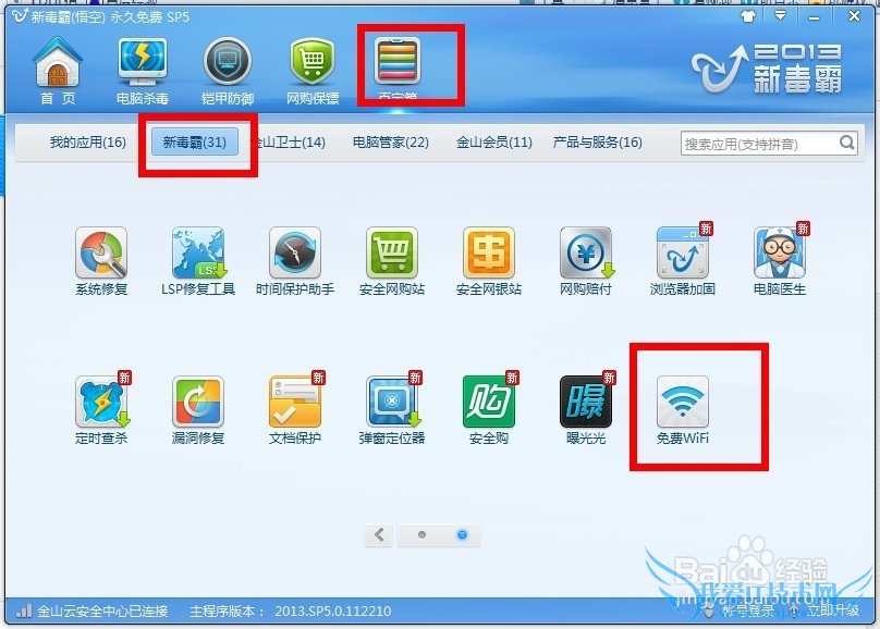 金山毒霸内置的“免费wifi”在金山毒霸的“百宝箱”里面 如图()。如果没有,升级一下毒霸就行。