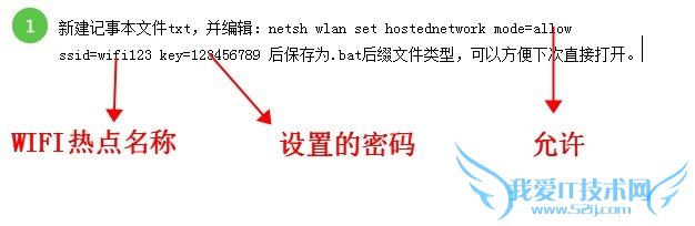 新建记事本文件txt,并编辑:netsh wlan set hostednetwork mode=allow ssid=wifi123 key=123456789 后保存为.bat后缀文件类型,可以方便下次直接打开。