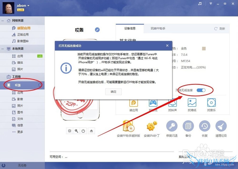 Ê×ÏÈ£¬ÒªÊ¹ÓÃWIFIÎÞÏßÁ¬½Ó£¬±ØÐëÊÇÔÚͬһ¸öÍøÂçÏ¡£ È»ºóÁ¬½Ó¹ý³Ì£º1.ÏÈÓÃÊý¾ÝÏßÁ¬½ÓÉ豸£¬´ò¿ªitunes£¬¹´Ñ°Í¨¹ýWIFIÓë´Ëiphoneͬ²½¡±£¬È·ÈÏ¡°Íê³É¡±¡£ 2.¹Ø±Õitunes£¬°ÎµôÊý¾ÝÏß¡£´ò¿ªPPÖúÊÖµçÄÔ¶Ë£¬¾ÍÄÜ¿´µ½É豸ÓëPPÖúÊÖÁ¬½ÓÉÏÁË£¬¿ÉÒÔÎÞÏßÏÂÔØÈí... >>Ïêϸ