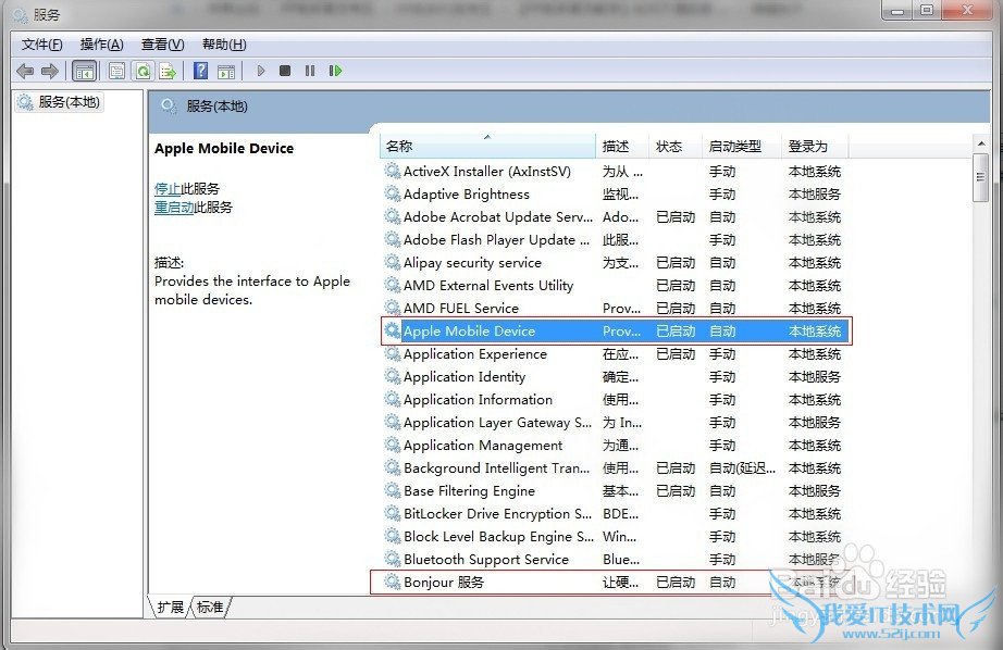 £¨2£©ÕÒµ½APPle mobile device ºÍBonjour ÕâÁ½¸ö£¬µã»÷ÓÒ¼ü¿´ÊÇ·ñÆô¶¯£¬µã»÷Æô¶¯
