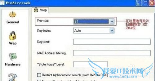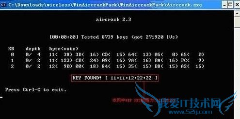 选择‘Key size’为64(目前大多数用户都是使用这个长度的WEPKEY,因此这一步骤完全是靠猜测选定该值),最后单击主界面右下方的‘Aircrack thekey…’按钮,此时将弹出一个内嵌在cmd.exe下运行的进程对话框,并在提示得出WEP密码。