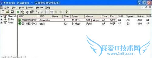 首先通过NetStumbler确认身边的热点,并通过WIFI信号的参数进行数据搜集,之后通过上图的红色框框部分内容确定该SSID名为demonalex的AP为802.11b类型设备,Encryption属性为‘已加密’,根据 802.11b所支持的算法标准,该算法确定为WEP。有一点需要注意:NetStumbler对任何有使用加密算法的无线站点都会在Encryption属性上标识为WEP算法,如上图中SSID为gzpia的AP使用的加密算法是WPA2-AES。