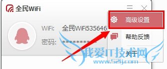 1.我们在电脑中成功的创建了腾讯全民wifi后,在主界面的右上角可以看到有一个拓展按钮,我们打开它会出现高级设置、帮助反馈以及关于三个选项,点开高级设置。