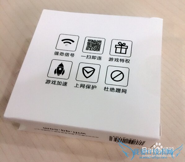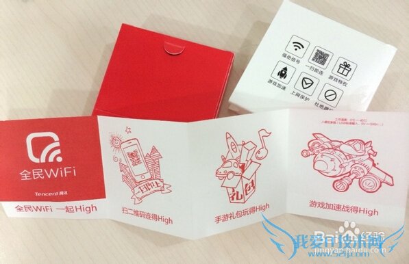 2.在外包装的后面,大家可以看到全民WiFi独具特色的六大功能的缩略图,分别是强劲信号、一扫即连、游戏特权、游戏加速、上网保护、杜绝蹭网。的确是很贴心呐,光看着外包装就知道腾讯的全民WiFi是多用心了。