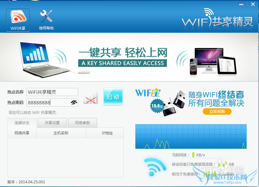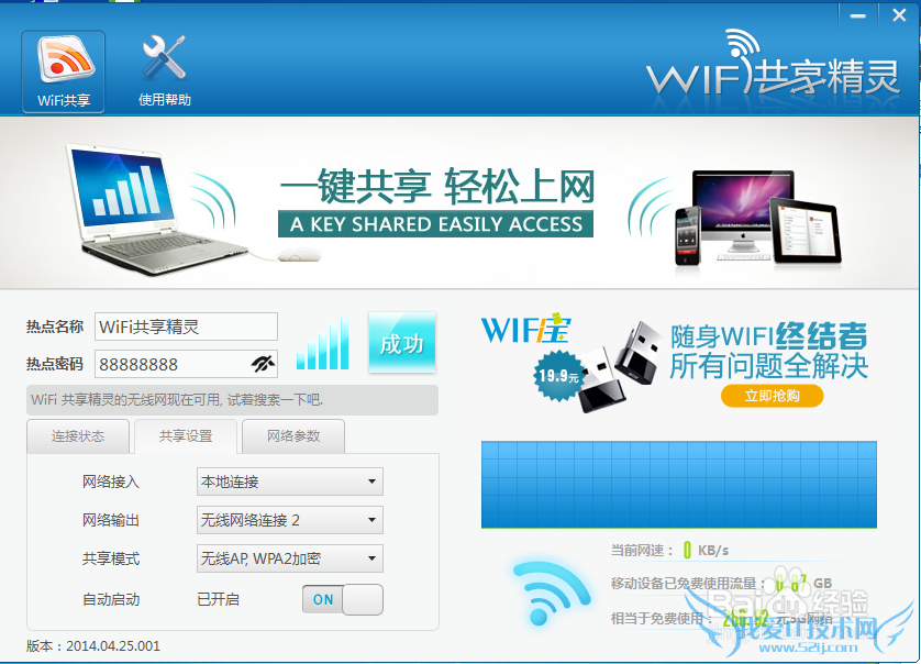使用WiFi共享精灵之类的软件,必须具备以下条件: 1.当前电脑能正常上网; 2.当前电脑上有一块多余的无线网卡(不能够正在使用中),并工作正常; 3.安装WiFi共享精灵; 【使用方法】 1.打开WiFi共享精灵,会自动检测当前电脑是否能够使用本软件... >>详细