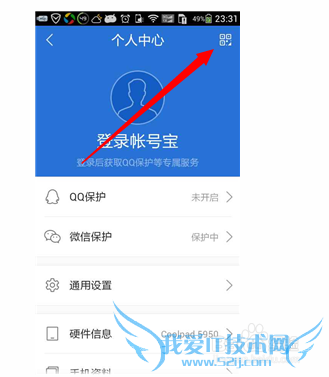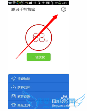 2,这样其实是不安全的,我知道腾讯手机管家的个人中心有个二维码的扫描功能,我们打开腾讯手机管家——点击右上角的头像标志