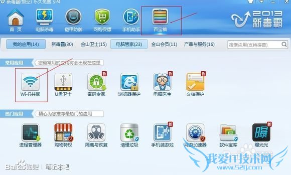 安装最新版金山毒霸软件,打开下图所示的百宝箱,在百宝箱里有个Wi-Fi共享的应用(如果没有这个应用请在线更新。),对!就是它!单击打开这个应用。