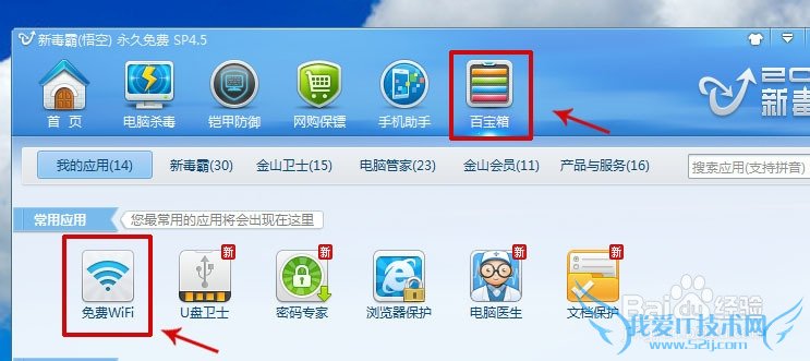 首先在百度里搜索下载一个金山新毒霸,安装完成后单击百宝箱里的免费WIFI如图: