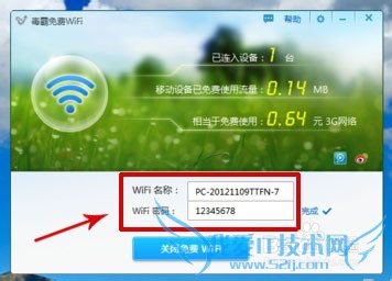 设置完成后,打开手机WIFI搜索WIFI名称:PC-20121109TTFN-7,搜索到以后输入密码,就可以上网了。如图: