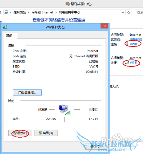 邮件电脑锁定时会让虚拟的无线断开,所以我们还得完善设置。在“网络和共享中心”中点击无线“VWIFI”,再点击打开的“状态”对话框中的“属性”按钮: