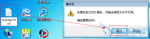 将文件重新命名为“mypage.html”注意这里一定要将文件扩展名.txt改为.html。否则没有效果,在弹出的重命名框中点击确认修改,如下图: