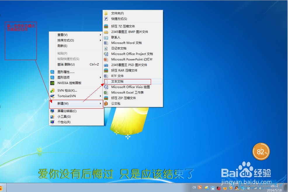 鼠标右键单击桌面空白处,在出现的鼠标右键菜单中选择新建,在选择文本文档,如下图: