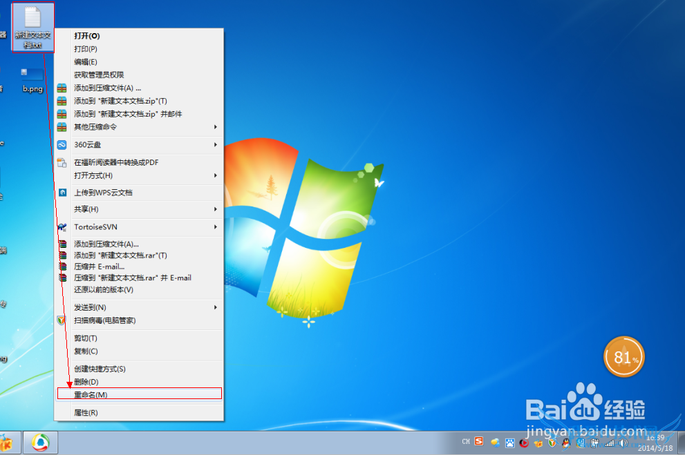 将鼠标放在“新建文本文档.txt”的文件上,右键单击在出现的右键菜单中选择重命名,如下图: