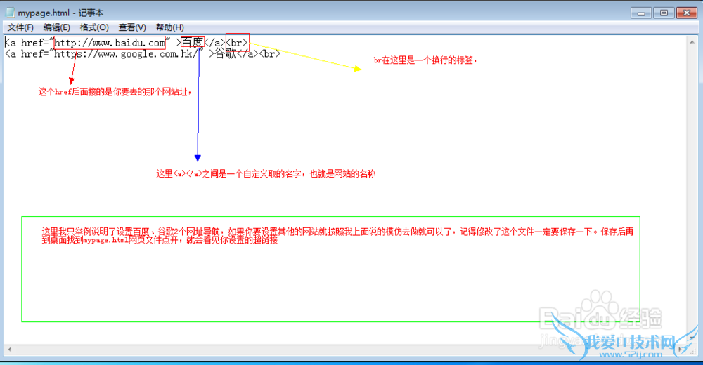 在打开的空白页面加上简单的HTML标签,这里我教大家使用超链接标签,详细使用规则请看下图: