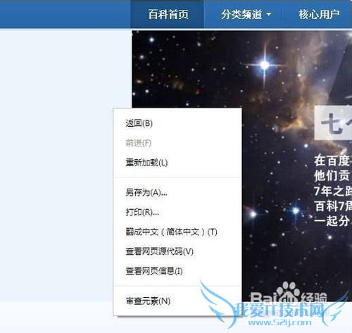 Google浏览器打开“百度百科”首页,然后点击鼠标右键,出现弹出小窗口