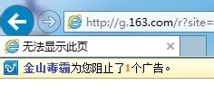 在图上可以看到有一个提示栏显示【金山毒霸为您阻止了1个广告】,我才想起来由于广告过多,我开启了新毒霸百宝箱里的【广告过滤】,并且在里面启用了一堆规则,难道是这里引起的?