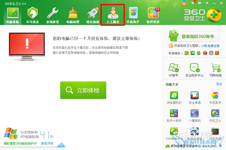 打开360卫士首页,选择人工服务。
