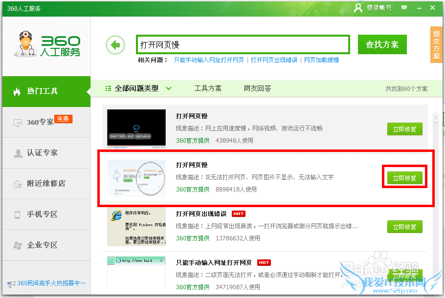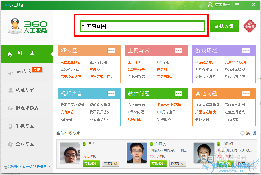 首先强调一下小编并不是一个技术流,遇到问题也只能求助百度和自己摸索方法。但今天突然间发现浏览器上网打开网页超慢,登陆阿里巴巴和淘宝也输入密码的界面都打不开。这个情况也曾经试过,之前试过重装浏览器也是白费功夫。今天想到360卫士的人工服务的功能,以前直接找专家,但免费的人工服务都是要排队的,小编也没有这个耐心。最后只能点热门工具逐个试,最后终于找到了一个效果比较显著的工具,解决了心头大患,颇有成就感,马上前来分享。