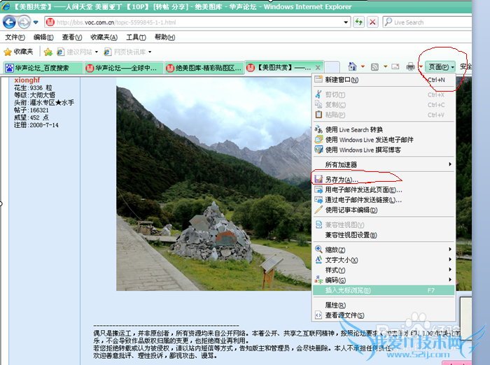 当我们看到有很多喜欢的图片的网页时,我们选择【页面】——【另存为(A)】如下图所示: