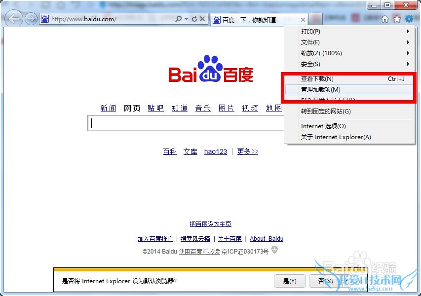 1,很多广告其实都是通过FLASH才能看到的,如果你不喜欢在网页上看电影,那么FLASH插件禁止后对你不会有任何影响,而且这些广告也就不能打扰你了,先打开浏览器的设置,选择管理加载项