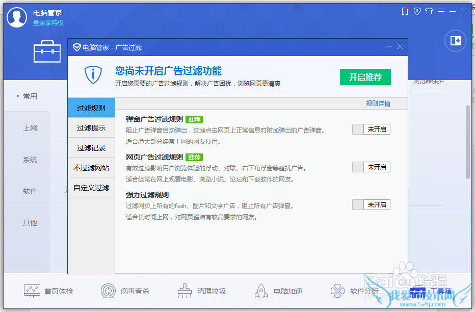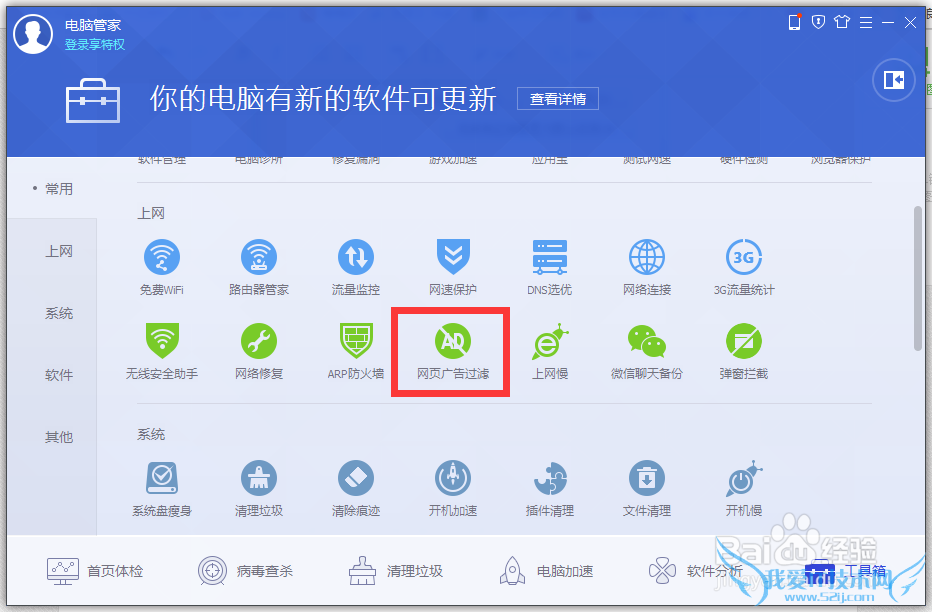1,其实上面说的都是牺牲一部分功能,来达到拦截广告的目的,最后一个办法是我觉得最好的,就是打开腾讯电脑管家——工具箱——网页广告过滤