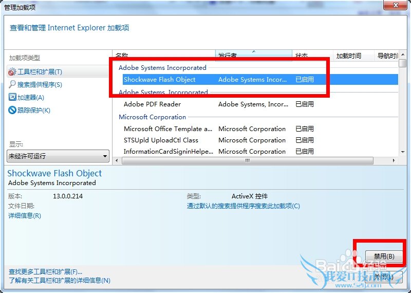 2,打开管理加载项后,在里面点击已加载的所有加载项,然后在里面找到FLASH插件,然后禁止启用,重新刷新一下网页就会发现广告神奇的消失了