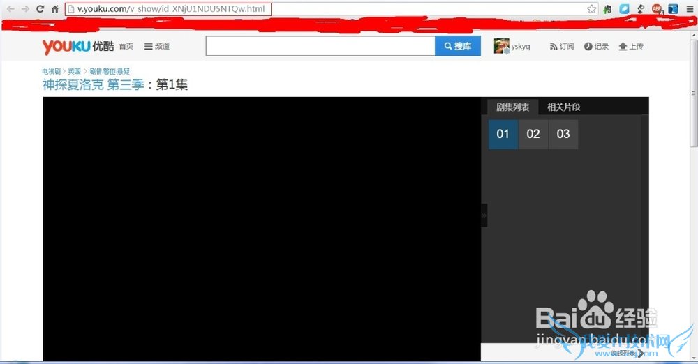 打开优酷 搜狐 土豆等任意有你想看的剧的视频网站,这里以优酷网的神探夏洛克第三季第一集为例。打开优酷,找到该视频,点击进入。不需要等待视频开头的广告播放,看到该网页地址栏的链接,复制该链接。