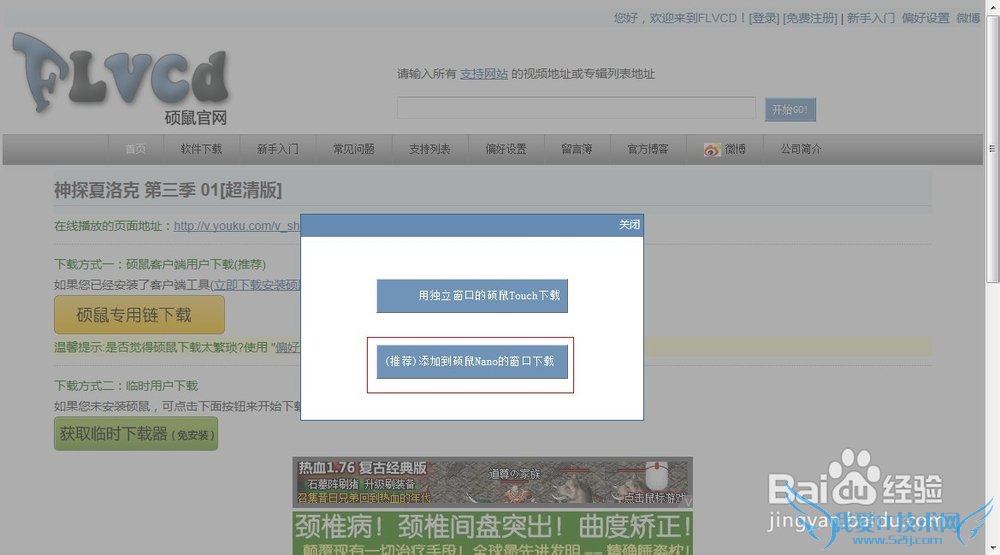 出现以下界面之后,点击“硕鼠专用链下载”,接着再弹出的对话框中选择“(推荐)添加到硕鼠Nano的窗口下载”。