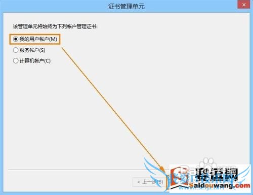 4、在证书管理单元的账户中选择“我的用户账户”,点击“完成”;
