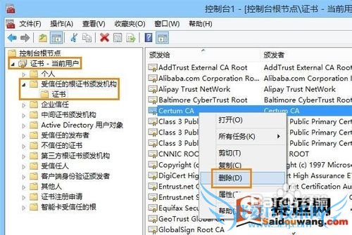 6、展开“证书”=》“受信任的根证书颁发机构”=》“证书” ,在右侧列表中查找你需要删除的证书,然后在将其删除;