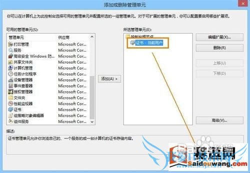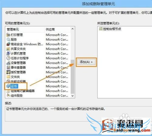 3、在弹出的窗口左侧列表中选中“证书”在点击“添加”;