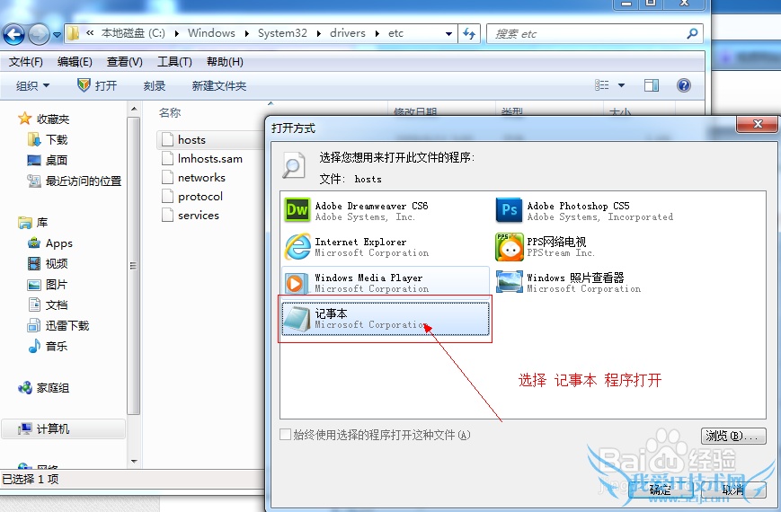找到在该文件夹下hosts文件,双击打开选择打开方式!看图!!