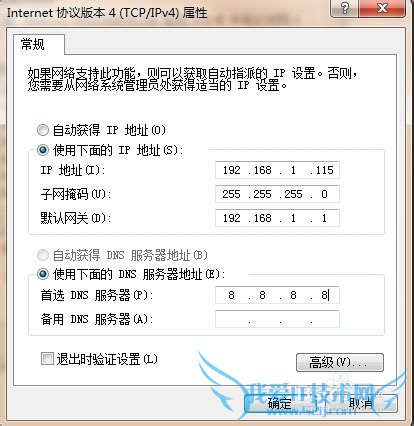 选择使用下面IP地址:地址为192.168.1.115或者192.168.0.115这个根据你路由器不同而定,子网掩码点一下就出来了,网关192.168.1.1.下面首选DNS服务器填入8.8.8.8这个事通用性的(建议百度搜索下当地的DNS一般有首选和备用两种),填写完成后点击确定返回到属性页面也点击确定。再次刷新我们打不开的网页是不是已经正常了。