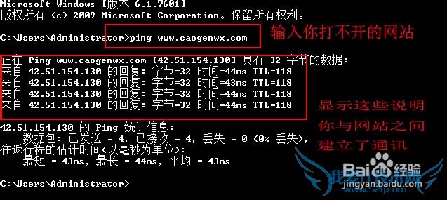 5、弹出DOS命令执行窗口,输入ping 某网站(输入你打不开的网站),例如:pingwww.caogenwx.com。ping和www之间有个空格,多试几个打不开的网站,如果显示是通的但是打不开那么就是DNS错误。